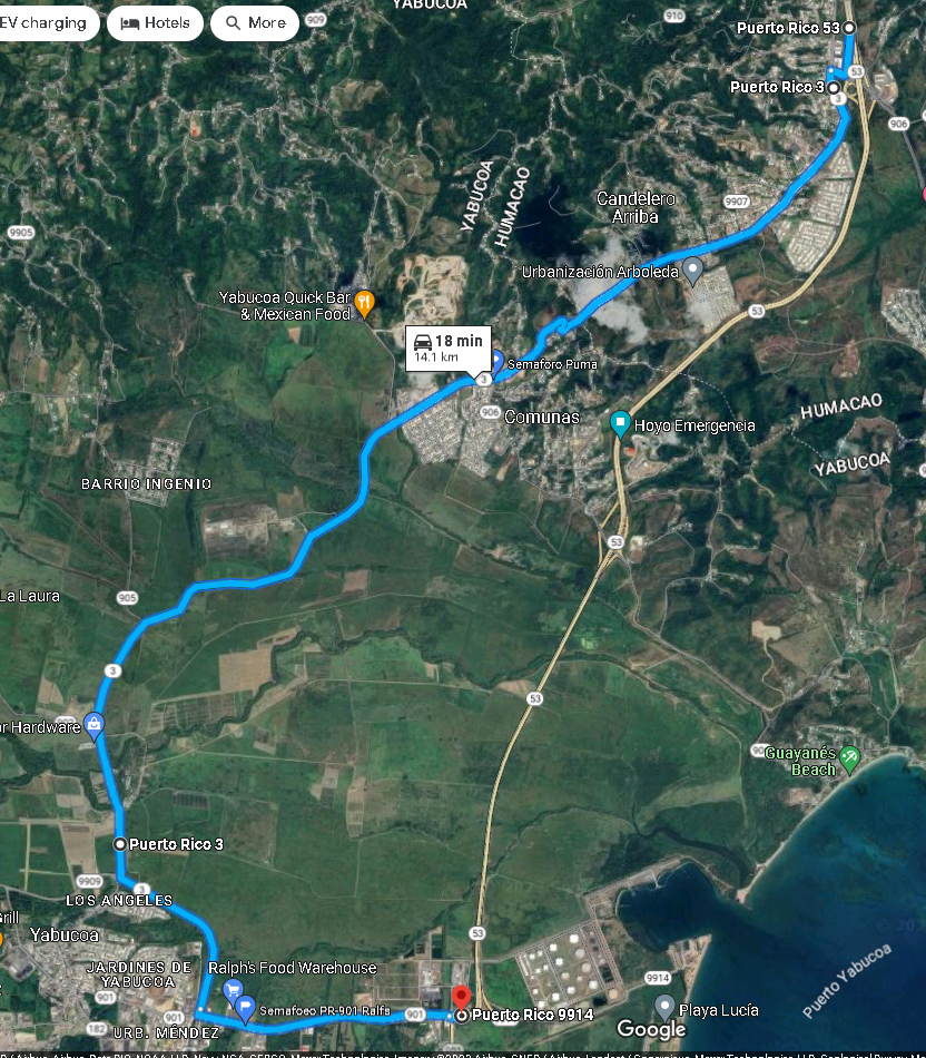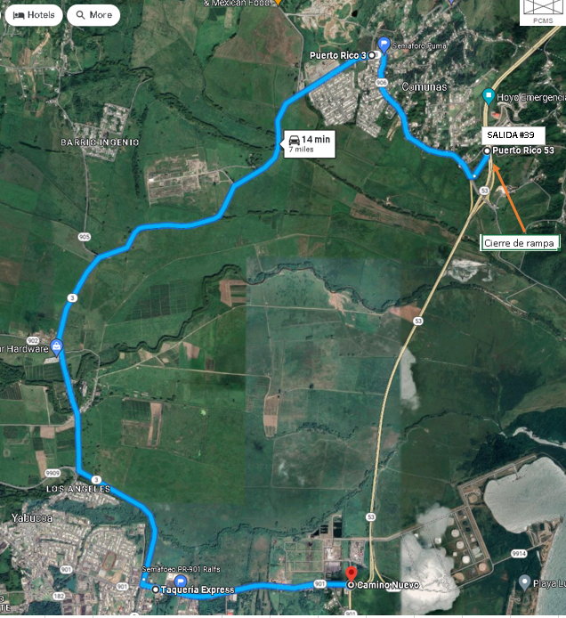 Opción 2 – Los conductores podrán utilizar la Salida 40 de la PR-53, doblar a la derecha en la PR-906 y doblar a la izquierda en la intersección con la PR-3. Continuar por la PR-3 en dirección sur hacia el centro del pueblo de Yabucoa, luego doblar a la izquierda en la PR-901 y continuar rumbo al oeste hasta la intersección con la PR-9914 en el pueblo de Yabucoa.