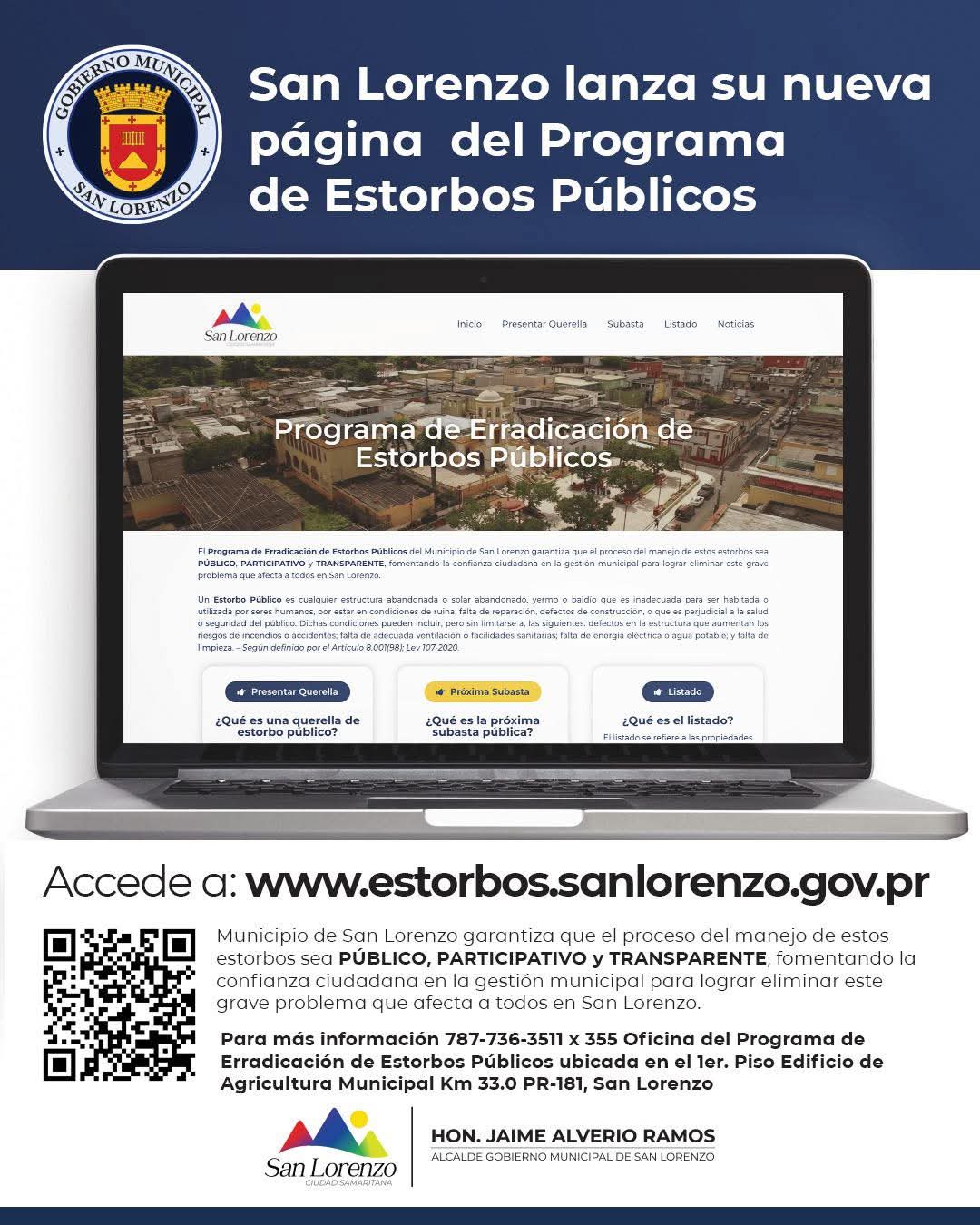 Finalmente exhortó a todos los que interesen obtener más información del programa que acceda al portal de lo que se trata el programa completo de estorbos públicos. Puede acceder a estorbos.sanlorenzo.gov.pr o llamar al 787-736-3511 extensión 355. También puede pasar por la Oficina del Programa de Erradicación de Estorbos Públicos localizada en el primer piso del Edificio de Agricultura Municipal.