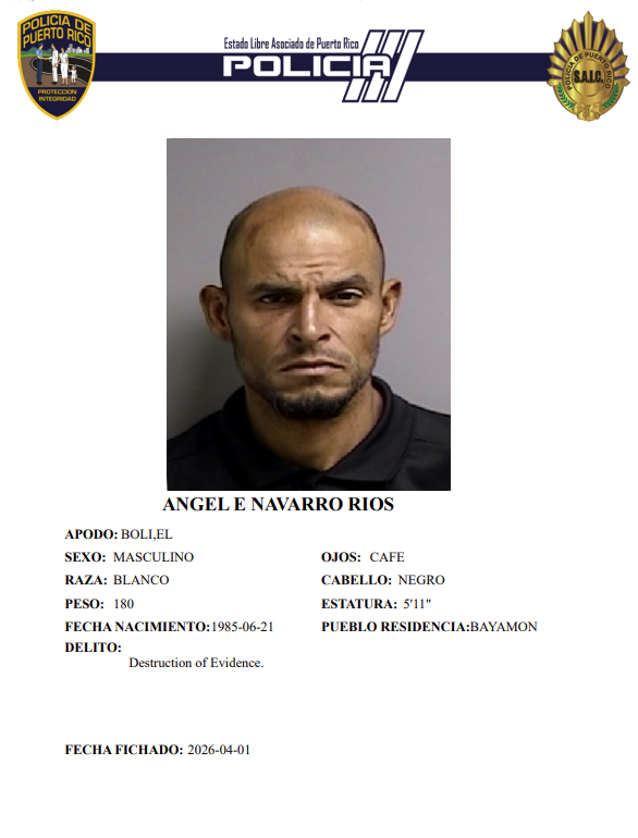 (2-abril-2026) La juez del Tribunal de Caguas, Nereida Salvá determinó causa para arresto contra Ángel E. Navarro Ríos de 40 años por ratería y destrucción de evidencia le impuso una fianza global de $105 mil dólares que no prestó, siendo ingresado en la Cárcel de Bayamón hasta la fecha de juicio.