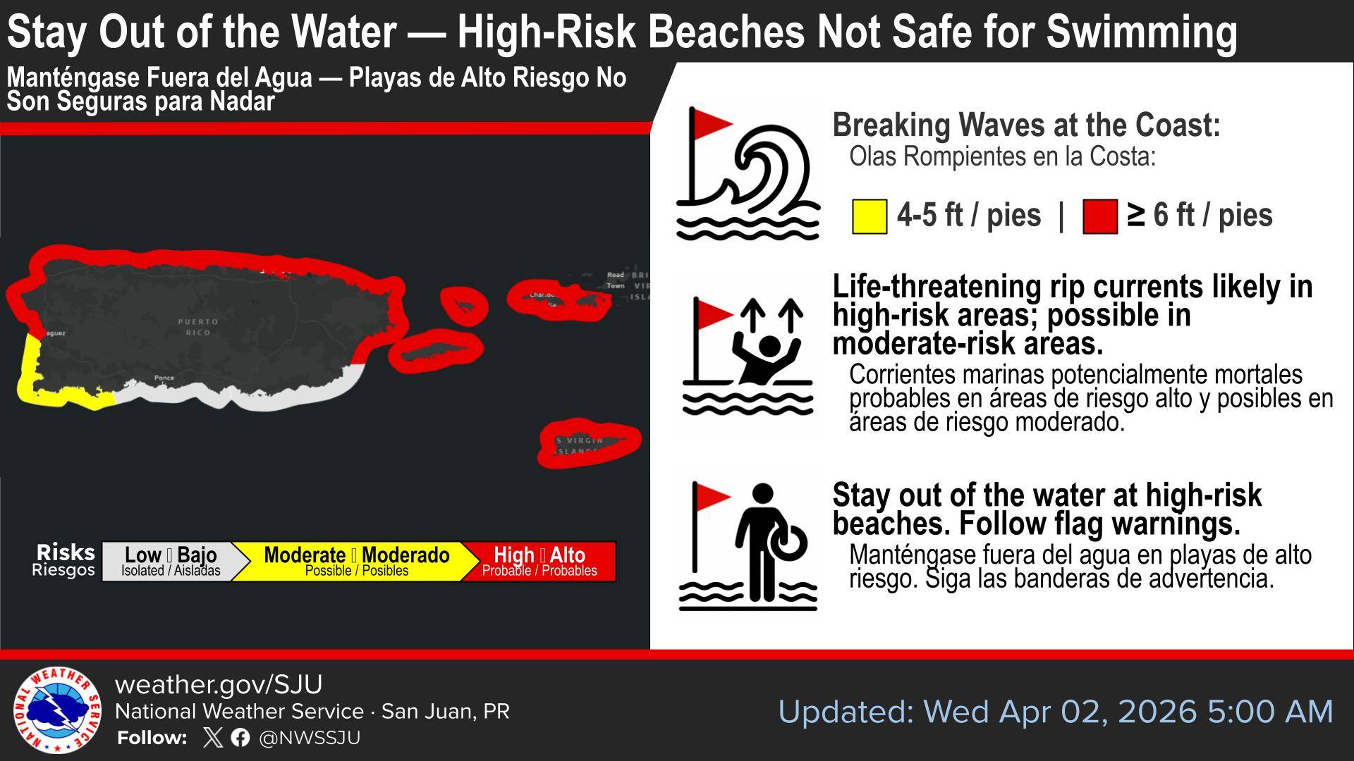 En las publicaciones del US National Weather en San Juan, se informó que “las condiciones peligrosas en las playas continúan hoy en Puerto Rico y las Islas Vírgenes”.