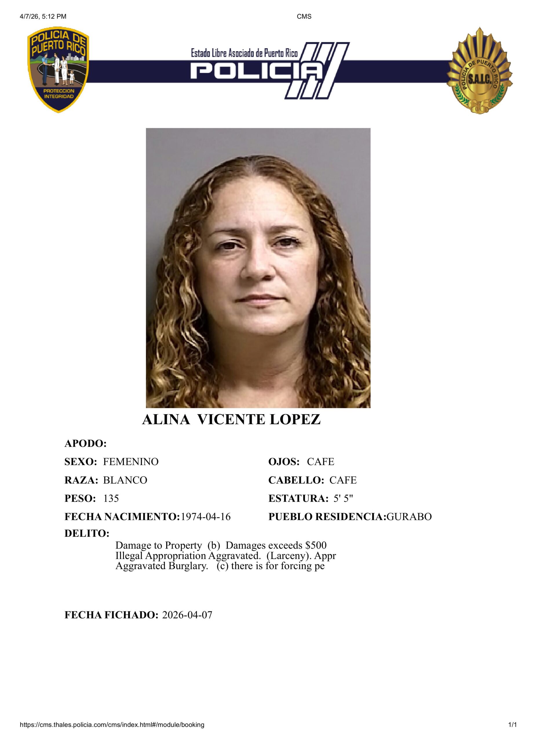 (8-abril-2026) Agentes adscritos al Negociado de Inteligencia y Arrestos del área de Caguas diligenciaron una orden de arresto contra Alina Vicente López, de 50 años y residente de ese municipio, quien enfrenta cargos por violaciones a los artículos 195, 199B y 182 del Código Penal.