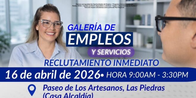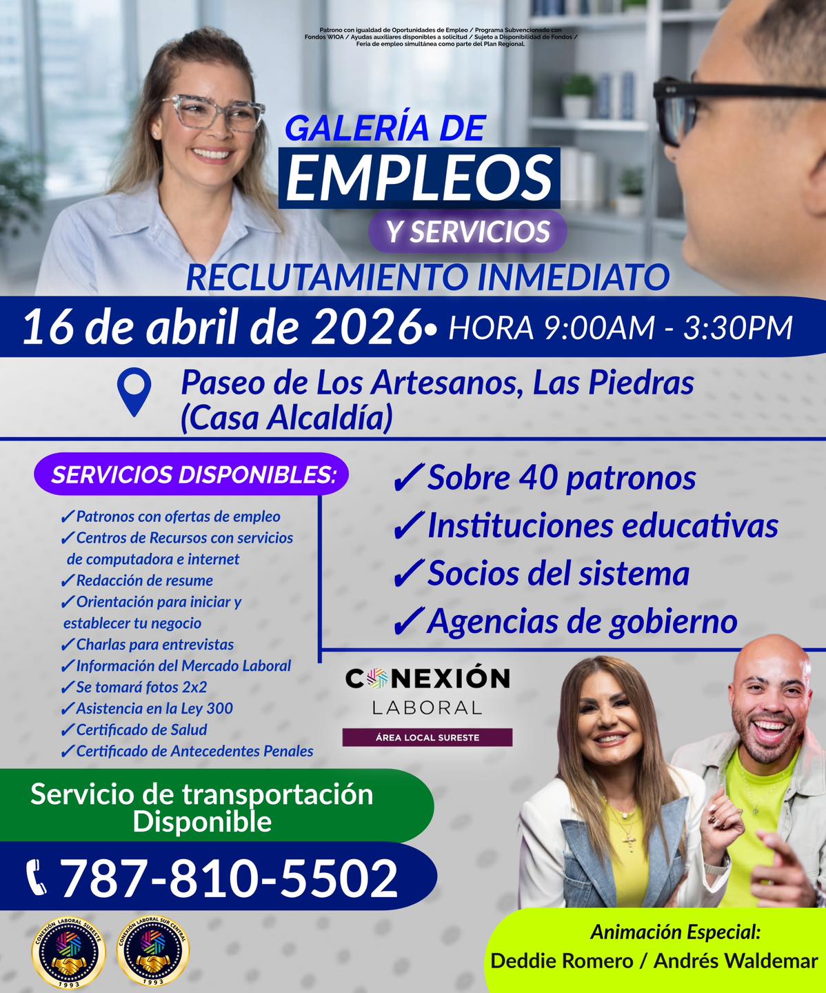 13 de abril de 2026 – El programa Conexión Laboral Área Local Sureste llevará a cabo una Galería de Empleos y Servicios con reclutamiento inmediato este jueves, 16 de abril de 2026, en el Paseo de los Artesanos, frente a la Casa Alcaldía de Las Piedras, en horario de 9:00 de la mañana a 3:30 de la tarde.