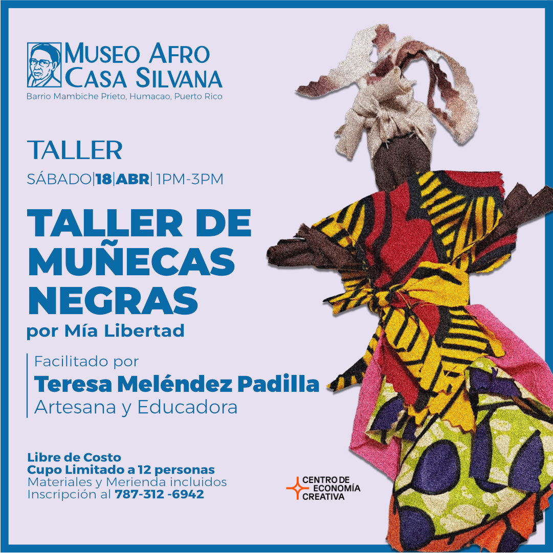 17 de abril de 2026. Humacao, PR – Las muñecas de trapo negras son una tradición textil que conecta memoria, identidad y narración oral afrodescendiente.  Por tal motivo el Museo Afro Casa Silvana invita a participar del Taller de Muñecas Negras con la Artesana Certificada Teresa Meléndez-Padilla, fundadora del proyecto Mía Libertad, el próximo sábado 18 de abril de 1:00 a 3:00 pm en sus facilidades.